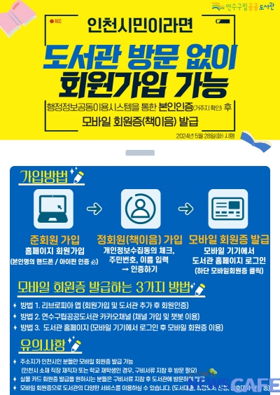 [뉴스카페]인천 연수구(구청장 이재호)가 이달 28일부터 도서관을 방문하지 않고도 홈페이지에서 간편한 본인인증을 통해 도서대출 회원(책이음회원)으로 가입할 수 있는 ‘비대면 도서대출회원 가입 서비스’를 시작한다.