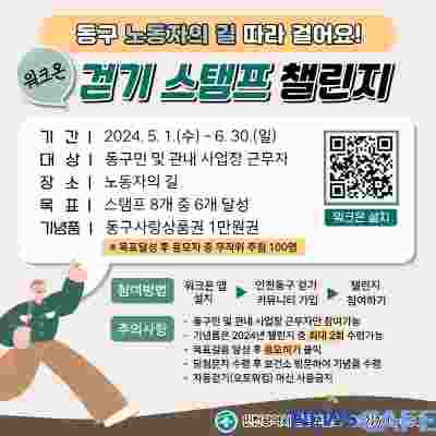 인천 동구 워크온 챌린지와 관련된 자세한 사항은 동구보건소 건강생활팀(770-6543)으로 문의하면 된다.