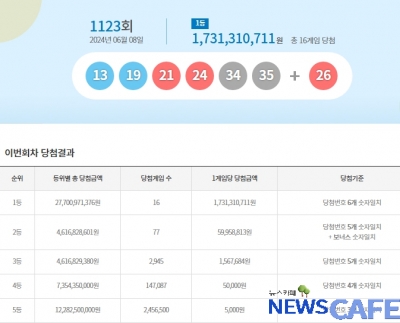 [뉴스카페]8일 추첨한 동행복권 1123회 로또6/45 1등 당첨자는 16명으로 1인당 17억3,131만원씩의 당첨금을 받는다.