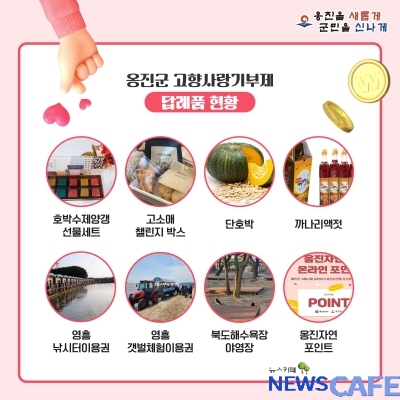 문경복 옹진군수는 “고향사랑기부제는 기부금으로 주민복지를 증진하고 답례품을 통해 지역경제를 활성화할 수 있는 좋은 제도”라며 “옹진군을 사랑하는 마음을 표현한 기부자분들에게 감사한 마음을 전할 수 있도록 앞으로도 옹진군만의 특색있는 답례품을 발굴하도록 노력하겠다.”고 말했다.