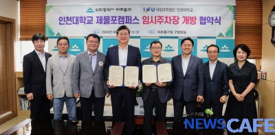 [뉴스카페]인천 미추홀구(구청장 이영훈)는 24일 구청장실에서 인천대학교(총장 박종태)와 ‘인천대학교 제물포캠퍼스 임시주차장 개방 협약식’을 체결했다.