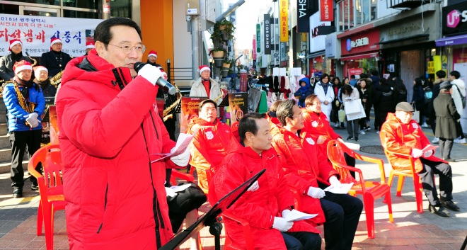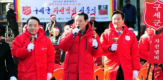 이용섭 광주광역시장이 8일 오전 동구 충장로 우체국 앞에서 열린 ‘구세군자선냄비 시종식’에 참석해 축하메시지를 낭독 하고 있다