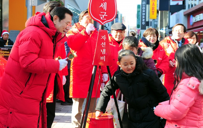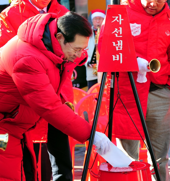 이용섭 광주광역시장이 8일 오전 동구 충장로 우체국 앞에서 열린 ‘구세군자선냄비 시종식’에 참석해 자선냄비에 기부를 하고 있다