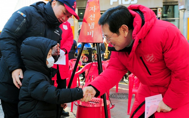 이용섭 광주광역시장이 8일 오전 동구 충장로 우체국 앞에서 열린 ‘구세군자선냄비 시종식’에 참석해 꼬마기부천사와 악수를 나누고 있다