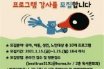 [뉴스카페]인천시교육청 서구도서관(관장 박진경)은 지역주민을 대상으로 2021년 평생학습프로그램을 운영할 참신하고 유능한 강사를 1월 25일까지 모집한다고 밝혔다. 모집은 유아 대상의 ‘엄마랑 함께 책놀이’, ‘영어 동화친구’ , 아동 대상의 ‘놀이수학 보드게임’, ‘나도 웹툰 작가’, ‘사고력 up 코딩’, ‘씽씽 어린이 중국어’ , 성인 대상의 ‘수묵 캘리그라피’, ‘하브루타 자격증과정’, ‘노인인지활동 책놀이지도사’ , 실버 대상의 ‘쉽게 배우는 ...